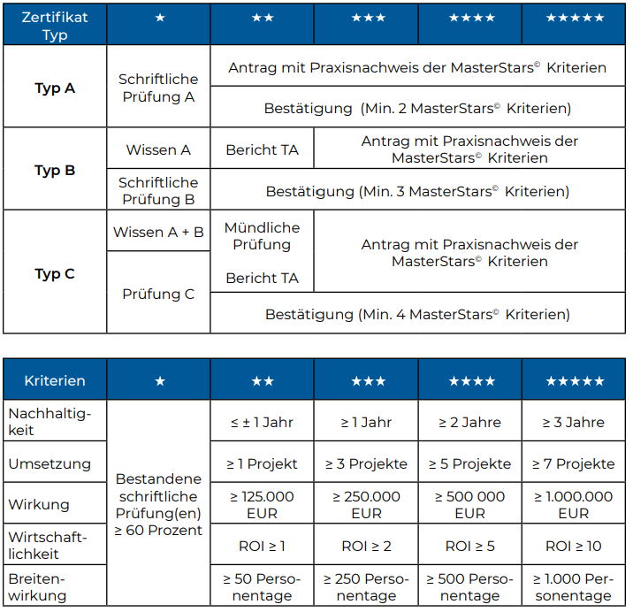 Für "two MasterStars" müssen Sie zusätzlich eine mündliche Prüfung bestehen und eine schriftliche Ausarbeitung (Transferarbeit TA) einreichen.