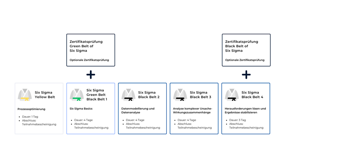 Der Weg zum Six Sigma Black Belt beginnt bei uns mit dem Yellow Belt, führt über den Green Belt und mündet schließlich im Black Belt. Jeder Schritt vertieft Ihre Kenntnisse in statistischen Methoden und der Anwendung von Six Sigma Werkzeugen, um Probleme effizient zu identifizieren und nachhaltig zu lösen.